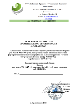 Получено положительное заключение экспертизы промышленной безопасности по объекту: «Обоснования безопасности опасного производственного объекта «Карьер». Опытно-промышленные испытания технологии формирования отвала пустых пород Павлик высокими ярусами в условиях месторождения Павлик». АО «Павлик».