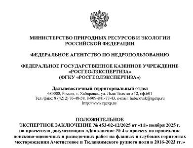 Получено положительное экспертное заключение ФГКУ «Росгеолэкспертиза» на проектную документацию «Дополнение №4 к проекту на проведение поисково-оценочных и разведочных работ на флангах и глубоких горизонтах месторождения Аметистовое и Тклаваямского рудного поля в 2016-2023 г.г».
